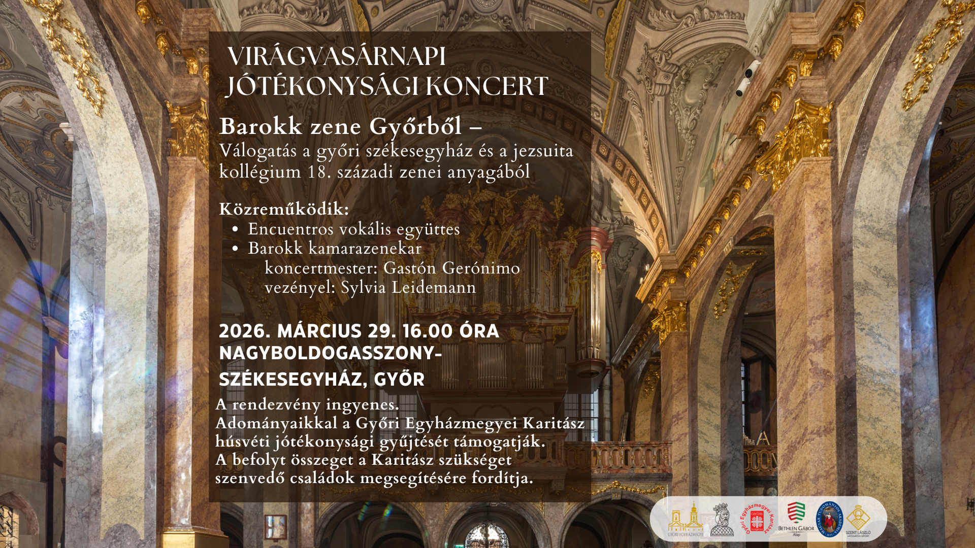 Szeretettel hívunk minden zenekedvelőt Virágvasárnap, 2026. március 29-én 16 órára egy különleges jótékonysági koncertre a Nagyboldogasszony-székesegyház gyönyörű barokk falai közé.