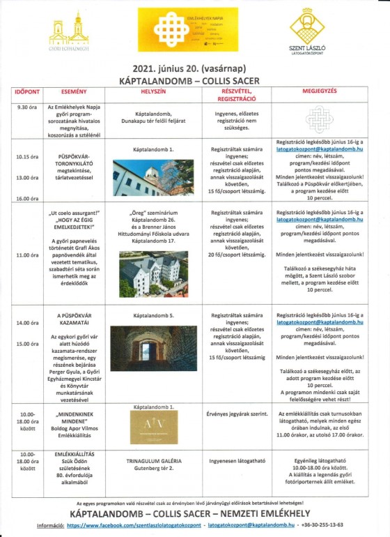 A Magyar Országgyűlés 2020 márciusában nyilvánította nemzeti emlékhellyé a győri Káptalandombot. Hogy a Collis sacer értékeit még jobban megismerhessék létogatóink, június 20-án, az EMLÉKHELYEK NAPJÁN 10.00-18.00 óra között tartalmas programokra várjuk az érdeklődőket. A programok legtöbbje ingyenes, de előzetes regisztrációhoz kötött.
