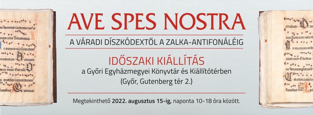 A Győri Egyházmegye ésa Szent László Látogatóközpont tisztelettel meghívja a kedves érdeklődőket az AVE SPES NOSTRA a váradi díszkódextől a Zalka-antifonáléig című időszaki kiállításának ünnepélyes megnyitójára, 2022. március 11-én, pénteken 17.00 órára a Gutenberg tér 2. szám alatt található Egyházmegyei Könyvtár és Kiállítótérbe.