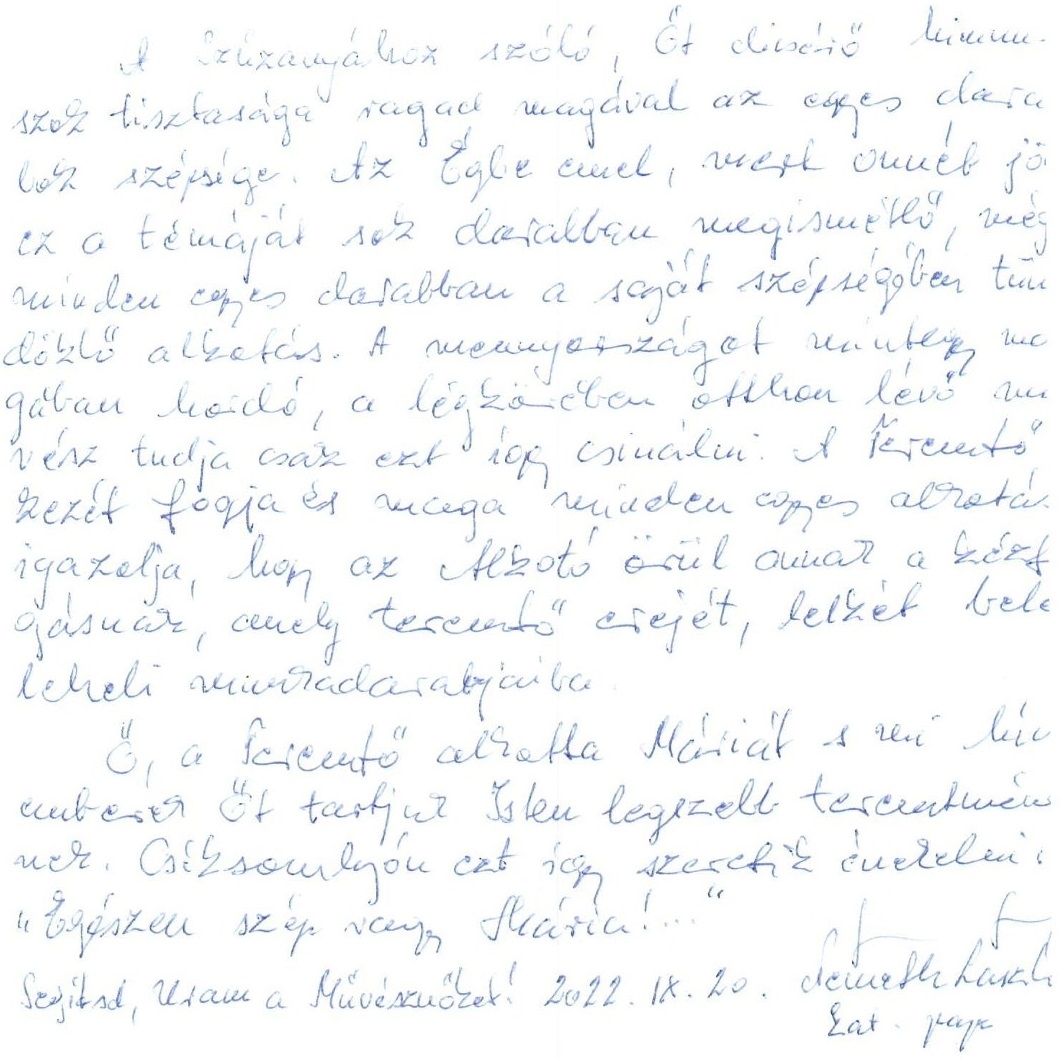 "A Szűzanyához szóló, Őt dicsérő himnuszok tisztasága ragad magával az egyes darabok szépsége láttán. Az Égbe emel, mert onnét jön ez a témáját sok darabban megismétlő, mégis minden egyes darabban a saját szépségében tündöklő alkotás. A Mennyországot mintegy magában hordó, a légkörében otthon lévő művész tudja csak ezt így csinálni. A Teremtő kezét fogja, és minden egyes alkotás igazolja, hogy az Alkotó örül annak a kézfogásnak, amely teremtő erejét, lelkét beleleheli munkadarabjaiba.