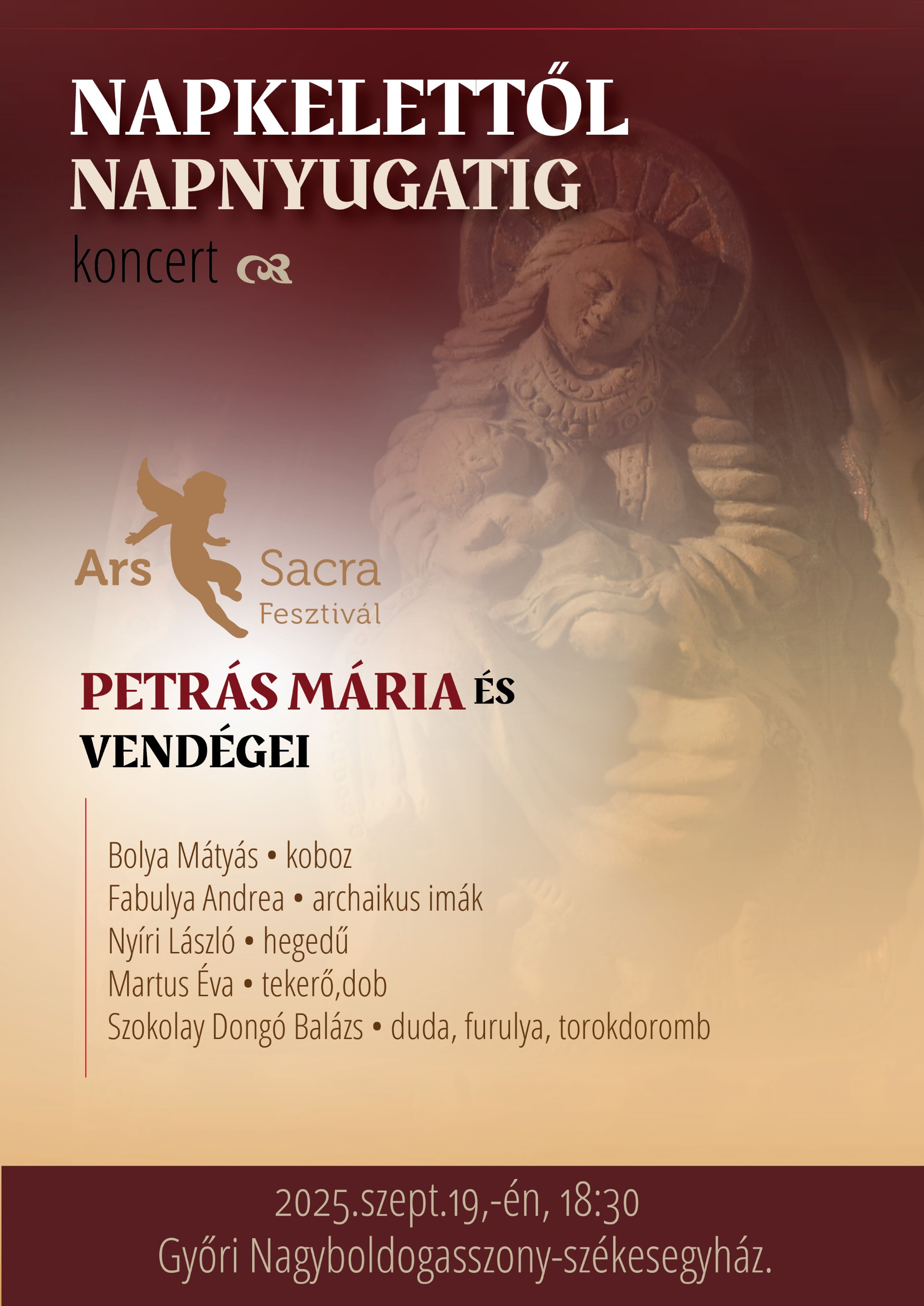 Petrás Mária Kossuth - és Magyar Örökség díjas népdalénekes és Vendégei előadásában az ARS SACRA FESZTIVÁL – 2025 keretében a NAPKELETTŐL NAPNYUGATIG c. koncertet hallhatják az Érdeklődők 2025. szeptember 19-én, pénteken a Nagyboldogasszony-székesegyházban.