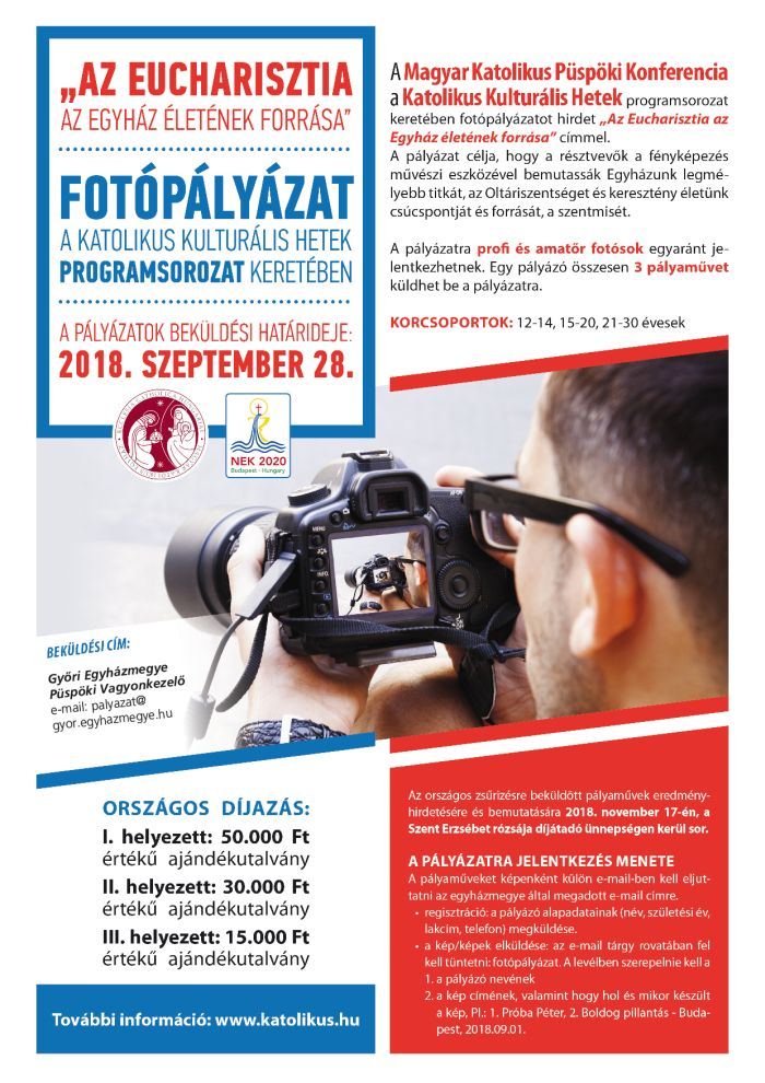A Magyar Katolikus Püspöki Konferencia a Katolikus Kulturális Hetek programsorozat keretében fotópályázatot hirdet „Az Eucharisztia az Egyház életének forrása” címmel.